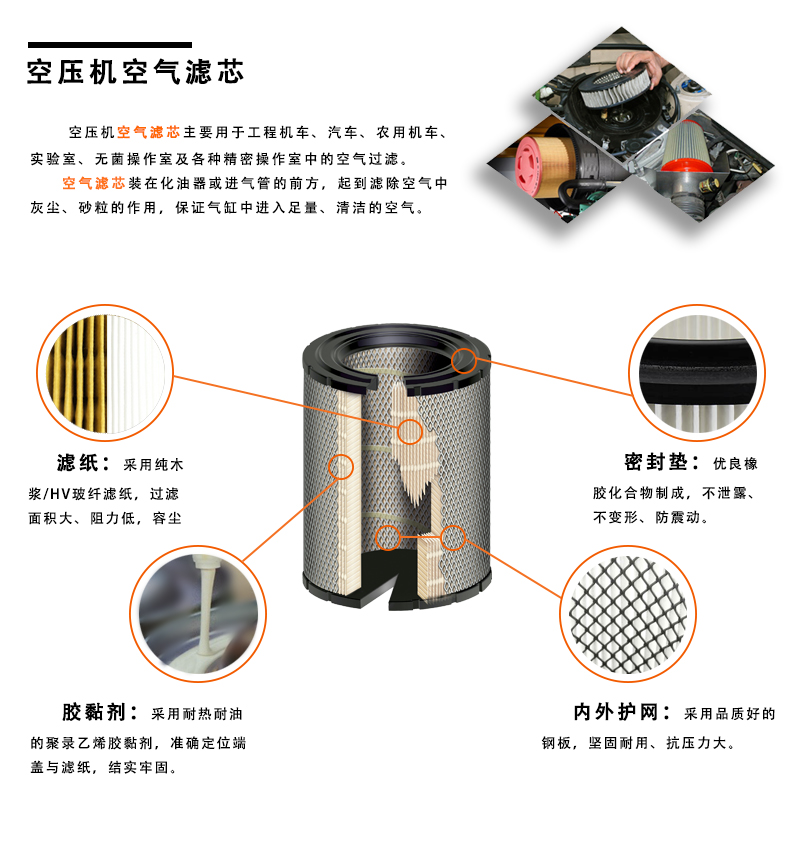 卅亞過濾6.2185空壓機空氣濾芯的功能是將主機產生的含油壓縮空氣進入冷卻器,經機械分離進入油氣濾芯進行過濾,對氣體中的油霧進行攔截和聚合,形成油滴集中在濾芯底部經回油管返回到壓縮機潤滑系統,使壓縮機排出干凈、有效的壓縮空氣;簡單說就是除去壓縮空氣中的固態塵埃、油氣粒子和液態物質的裝置。